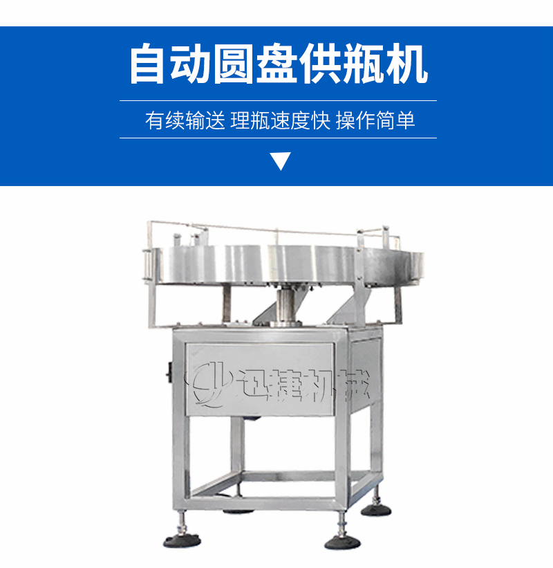 該圓盤供瓶機理瓶機是由人工將瓶子放入圓形轉盤上,轉盤轉動將瓶子有續撥入輸送帶,進入灌裝機進行灌裝。使用方便,噪音小,理瓶速度快,操作簡單是不可缺少的一個環節。